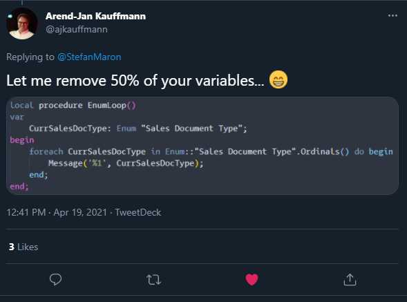 Line 7: With the function “FromInteger” we can convert an ordinal to an actual enum value. This is saved to the variable “CurrSalesDocType” for further usage in the current iteration.